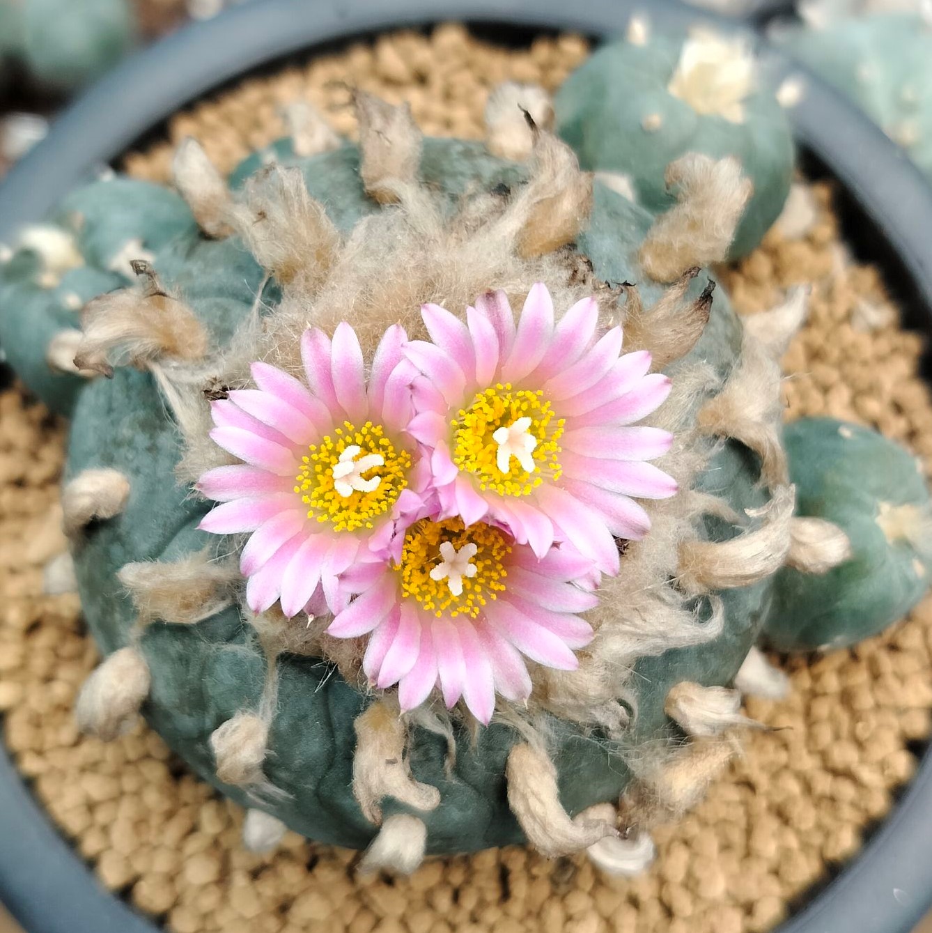 Species & Origin: Lophophora fricii cv. Ibo Ginkamuri (Japanese advanced hybrid), variant of cv. Ibo from Coahuila stock with enhanced ribbing and multi-head formation.